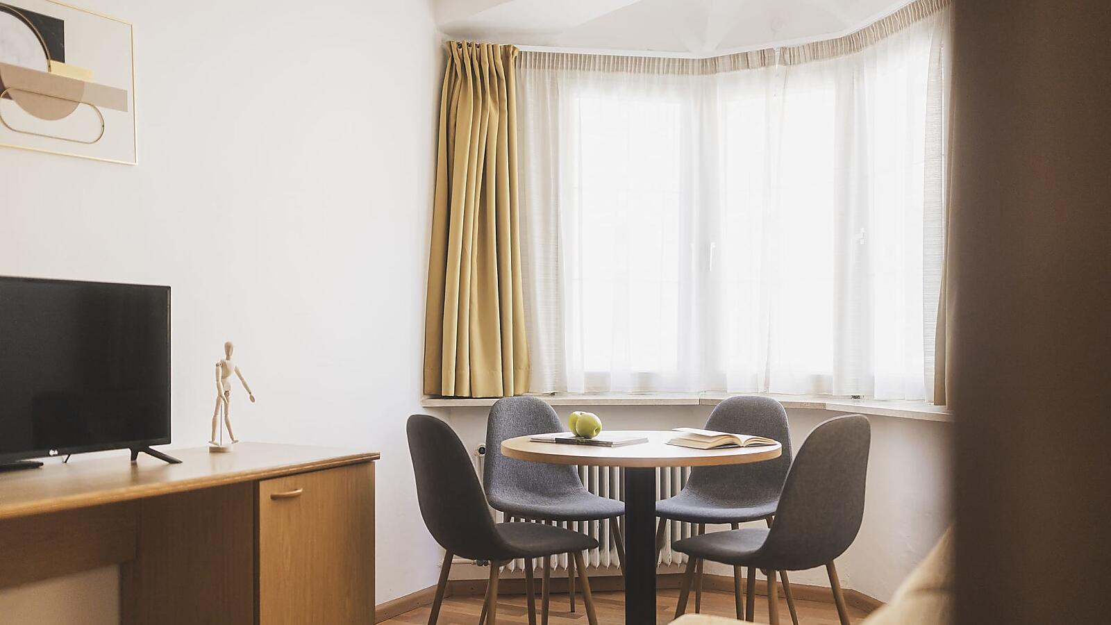 The separate living area with a dining nook offers a view of the pedestrian zone and the historic city center of Brixen. Two separate sofa beds provide space for up to 4 people. The separate bedroom with a cozy seating area invites you to relax.