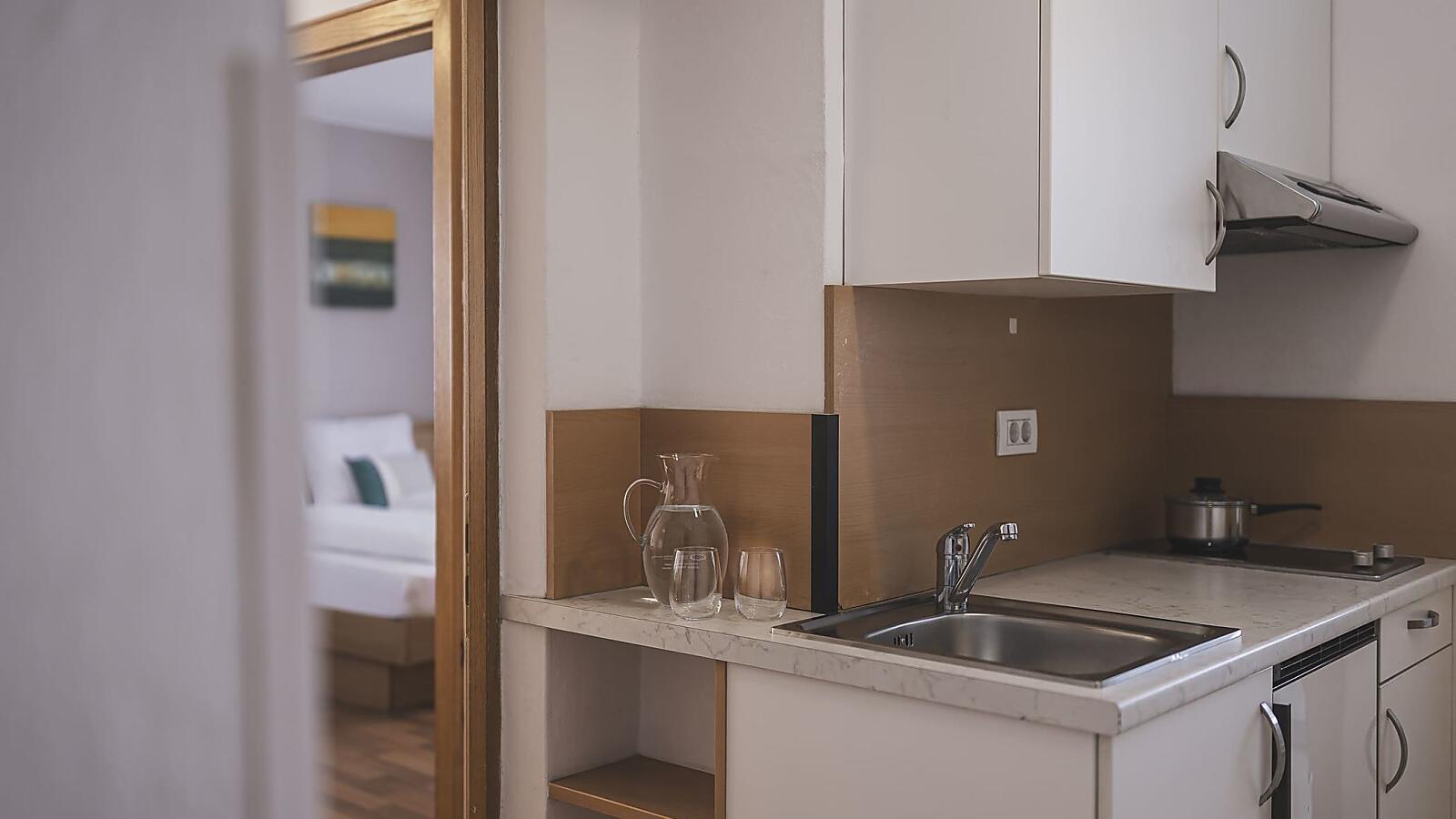 The apartment features a small kitchenette, bathroom with shower, bidet, and Rituals toiletries. The apartment is located on the mezzanine floor.